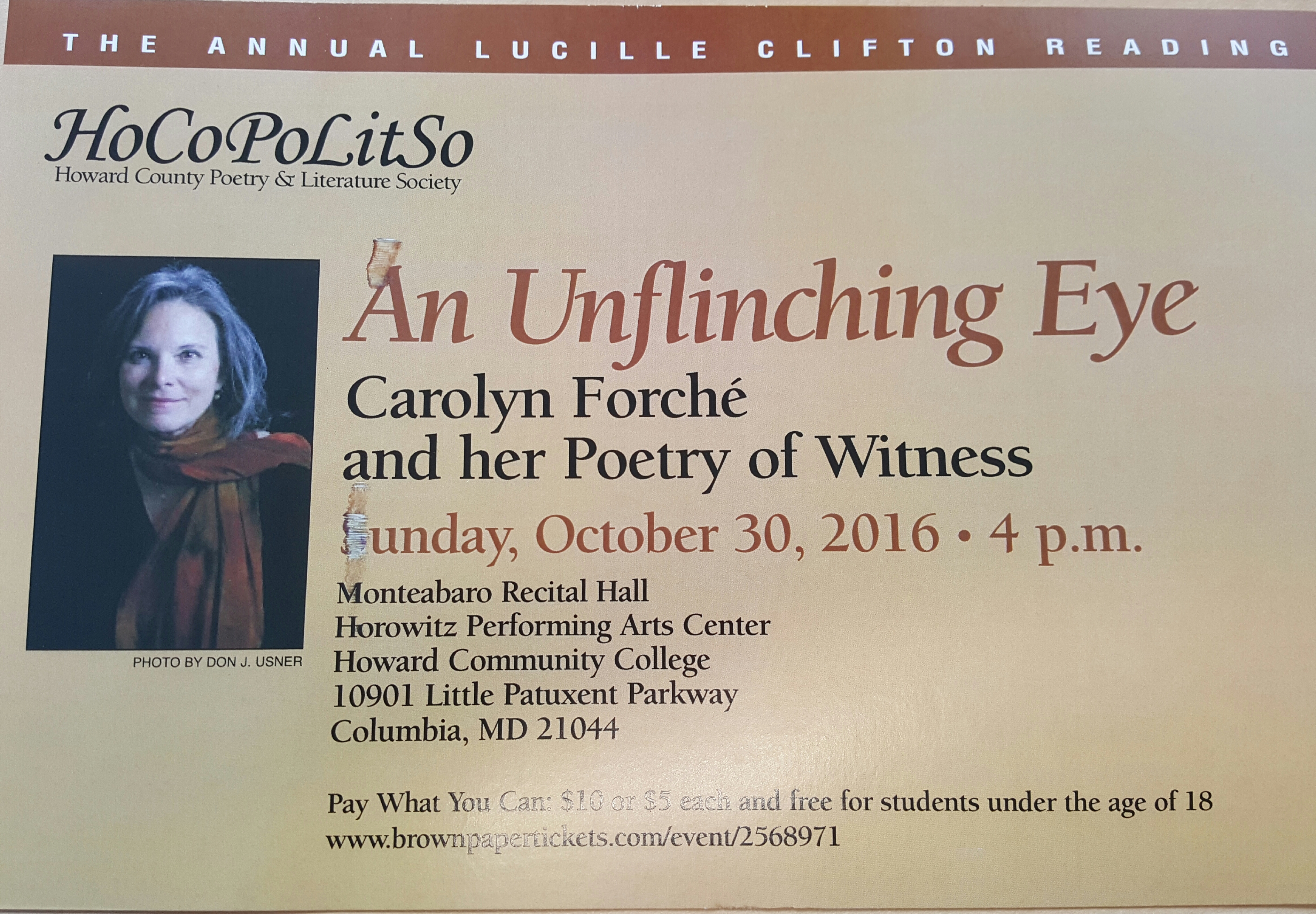 To reserve your ticket for the Lucille Clifton Reading to hear Carolyn Forche and her Poetry of Witness at Monteabaro Hall at Howard Community College, please visit: http://brownpapertickets.com/event/2568971