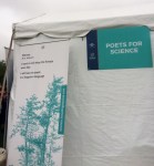 The activities inside the tent were directed by Kent State University’s Wick Poetry Center and its Traveling Stanzas program. As the rain pattered on the tent’s ceiling, hundreds of people created “emerge” poems, striking out some words in long paragraphs of scientific language. Copies of the speeches given on the stage that day were handed to anyone who came in – from four-year-olds to gray beards. Using markers, the authors crossed out blocks of words, leaving poems to emerge from the blackness.