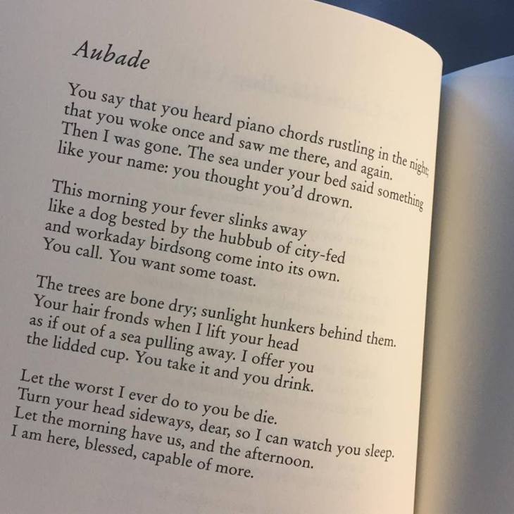 The poem “Aubade” from Spindthrift takes on a different sort of in-between-lovers morning scenario. As readers, we are on the sickbed where the caretaker of the couple narrates understanding and affection while tending the beloved. It is hardly a place for a love poem, one would think, but oh how it is. The poem is pictured here in its entirety, so have read.
