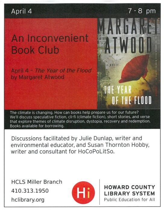 Join the new discussion group sponsored by HoCoPoLitSo and Howard County Library, An Inconvenient Book Club. The first meeting is in April, so you’ve got a little time to read the first book. We’ll be reading speculative fiction, cli-fi (climate fiction), short stories and verse exploring themes of climate disruption, dystopia, recovery, and redemption. Discussions facilitated by Julie Dunlap, environmental author and educator, and Susan Thornton Hobby, writer and consultant for HoCoPoLitSo.