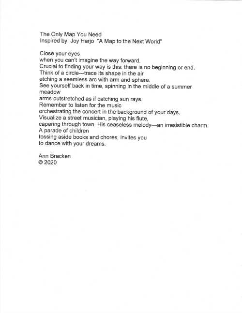 Local poets were charged to include lines from the nationally known poets, including Clifton’s line “what did I see to be except myself” from “won’t you celebrate with me”; “Out of the Cradle Endlessly Rocking” from Whitman; “’Hope’ is the thing with feathers” from Dickinson; the line from Joy Harjo’s “A Map to the Next World” that reads “Crucial to finding the way is this: there is no beginning or end”; and Tiffany Higgins’s line “I’d dance my last dance to rescue the hive,” from “Dance, Dance While the Hive Collapses.”