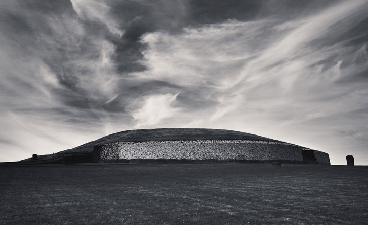 North of Dublin, along the River Boyne in Ireland, lies a one-acre prehistoric phenomenon called Newgrange. Before Stonehenge was pushed into place, before the Egyptians built the pyramids, the Irish brought stones from all over the island to build this circular passage tomb, 90 meters in diameter. Massive carved stones ring the 39-foot-high grass-covered mound over a central stone tomb, where remains of the dead were burned and sometimes buried.