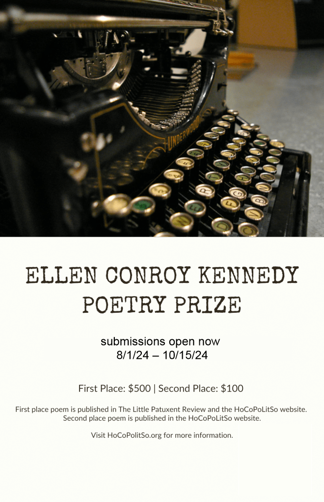 The author of the poem selected for first place will be awarded a cash prize of $500, celebrated on HoCoPoLitSo’s website, social media, and in our annual report— and have their winning poem published in The Little Patuxent Review and right here on HoCoPoLitSo’s front page.