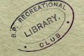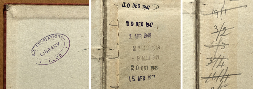 Part of my dad’s version of the story was personal history, working in England years later, and having associates who dated back to the war. I’ll skip all the details, but so-and-so knew so-and-so-and-so and the narrative found its way to explaining the book I had in my hand. Inside the front cover was an oval stamp “B. P. Recreational Library Club”, and, on the facing page, an oddly glued-in, folded-over piece of paper with dates from the forties stamped onto it. Under that was a listing of hand-written month/day dates, all crossed out.