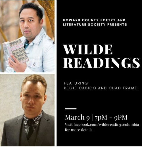 Regie Cabico and Chad Frame are the feature writers at the March Wilde Readings, a monthly community open mic supported by HoCoPoLitSo. Join Regie and Chad as well as other open mic readers for a free, virtual reading on Tuesday, March 9th at 7:00 pm. Register here. Get to know Regie and Chad with our Six Questions.