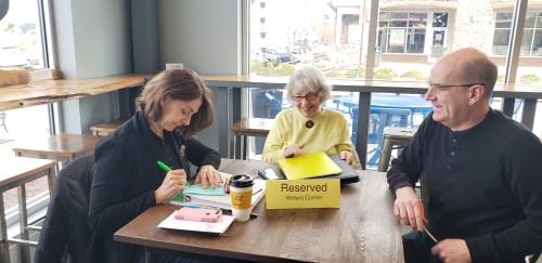 The first one took place on January 28th. In one corner of the Common Kitchen, tables were reserved for “Writers Corner.” As each person came in from the cold and joined the group, Laura introduced everyone. We sat together, each with his or her laptop or notebook, and worked quietly. Poet Patricia VanAmburg, who was at the write-in, shared with me how important it is for her to have a writing partner. She and author Ann Bracken are longtime critique partners who meet on a weekly basis to share their writings and give each other feedback. So, Patricia welcomed this new gathering of writers. Laura says 8 people attended this first write-in, including a few members of the he MD-DE-WV chapter of SCBWI (Society of Children’s Books Writers and Illustrators) and Mel Beatty who is a bookseller at the Curious Iguana bookstore in Frederick, Maryland. HoCoPoLitSo’s Tim Singleton (who worked on this piece in the session) and Susan Thornton Hobby also joined the writing fun.